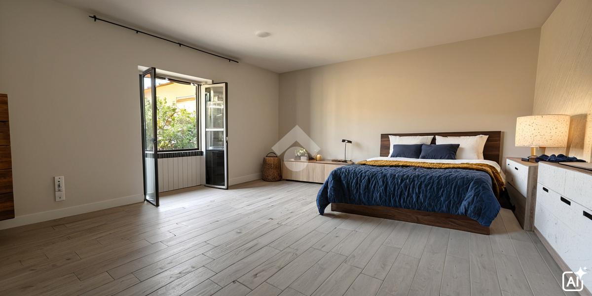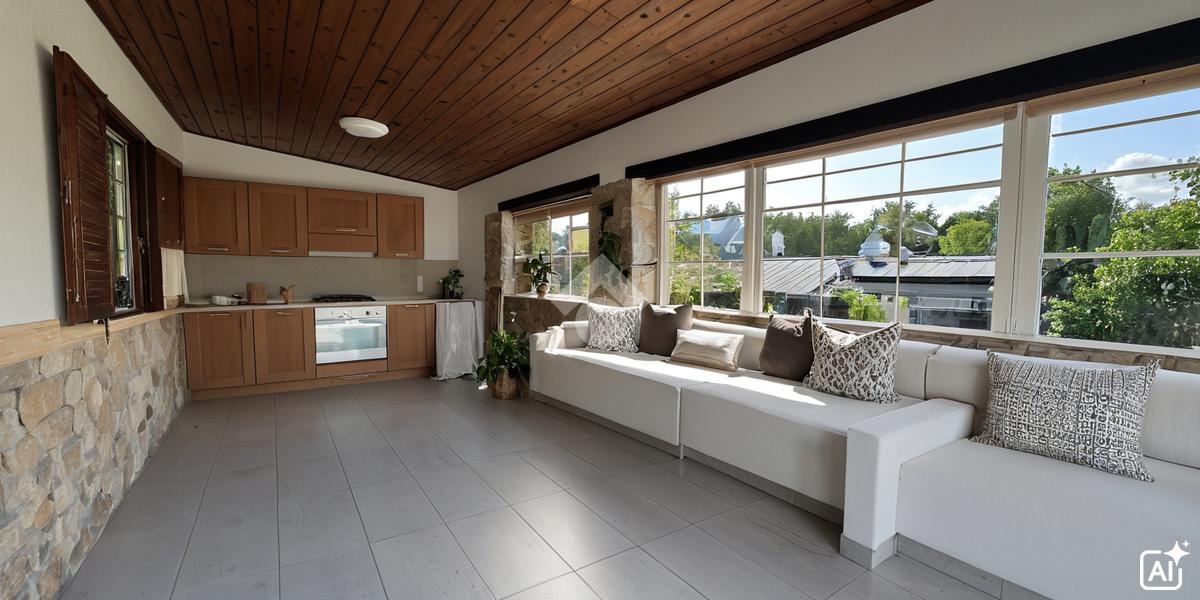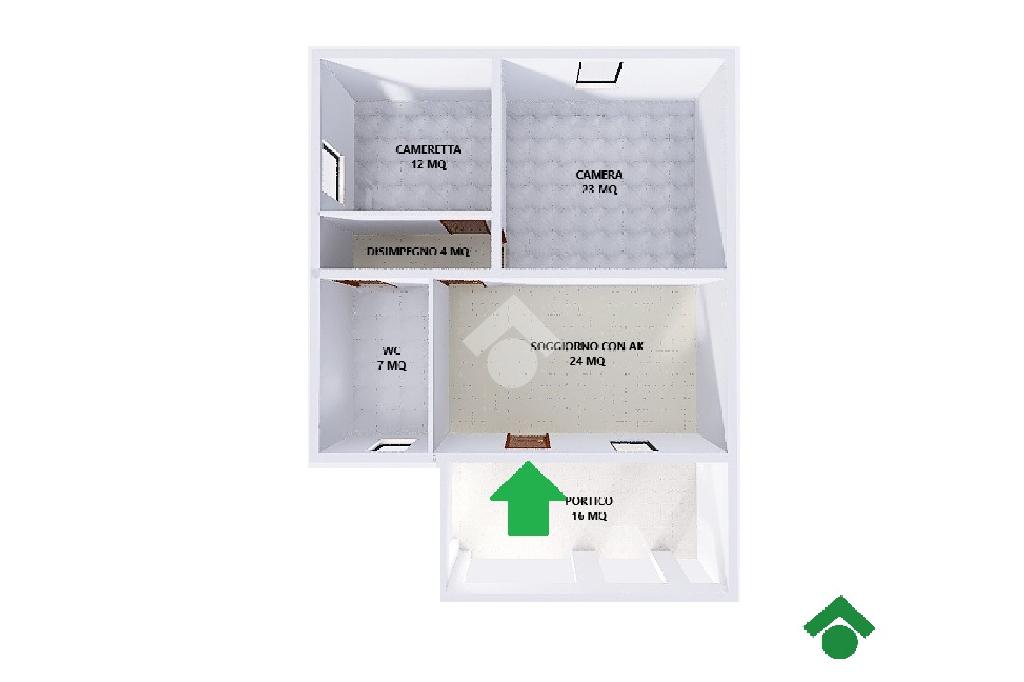 Attraversando il portico, si accede alla zona giorno con angolo cottura, seguita da un disimpegno che conduce alla zona notte composta dalla grande camera matrimoniale, una cameretta confortevole ed un ampio bagno finestrato con doccia.