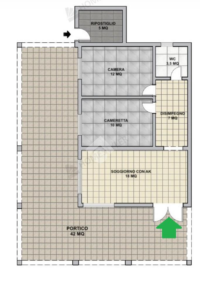 Attraverso un portico coperto di circa 50 mq, disposto su due lati e ideale per pranzi all'aperto o momenti di relax, si accede all'interno della casa. La zona giorno è composta da un soggiorno con angolo cottura e camino, ambiente caldo e accogliente che rappresenta il cuore della casa. Un disimpegno conduce alla cameretta, alla camera matrimoniale e al bagno, garantendo una distribuzione degli spazi funzionale e confortevole.