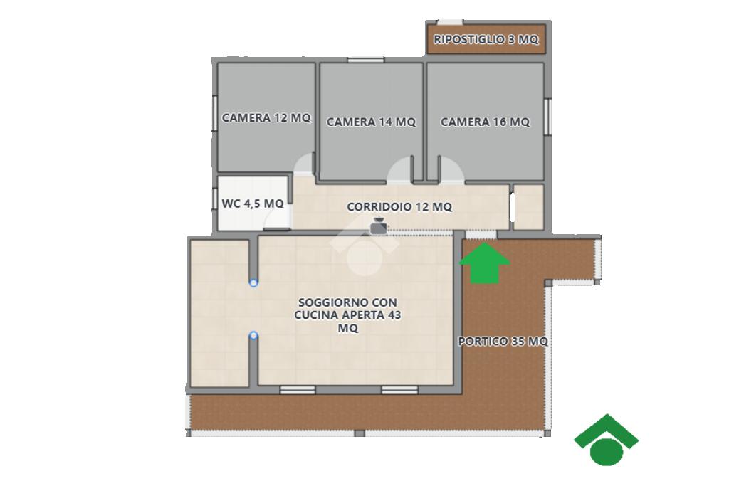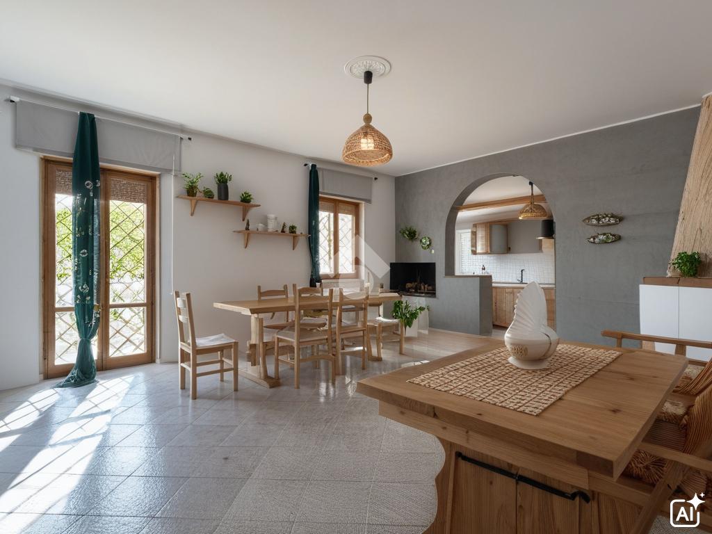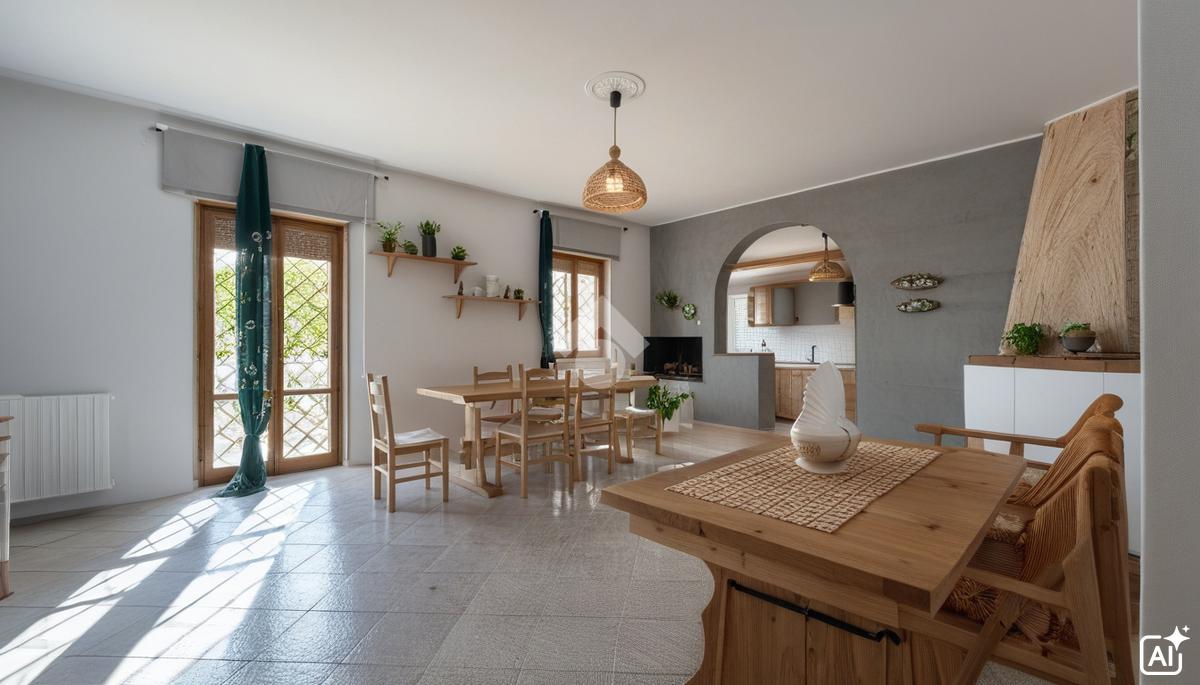 L’accesso alla proprietà avviene tramite un ampio portico, che si sviluppa su due lati dell’abitazione e rappresenta uno spazio esterno versatile, perfetto da vivere durante tutto l’anno. Dal portico si accede alla porta d’ingresso blindata, che introduce agli ambienti interni.